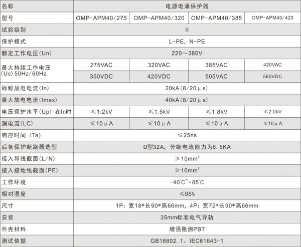 40KA二級(jí)電涌保護(hù)器SPD(又稱電源防雷器、電源避雷器、浪涌保護(hù)器、過壓保護(hù)器) OMP-APM40-