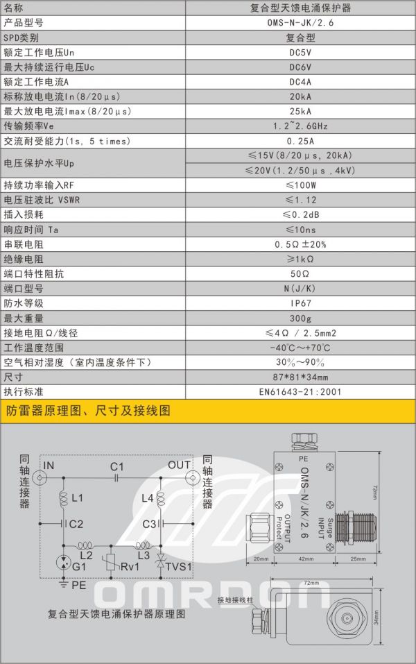 歐姆雷盾(OMRDON)1.2-2.6G天饋電涌保護(hù)器(SPD、防雷器)是專門為GPS/BD通訊基站通信頻段收發(fā)系統(tǒng)設(shè)計(jì),使其免遭由天饋線引入的感應(yīng)雷擊及靜電放電等過(guò)電壓損壞。本產(chǎn)品具有防水、防塵功能,可用于室外安裝場(chǎng)所。