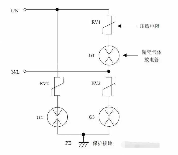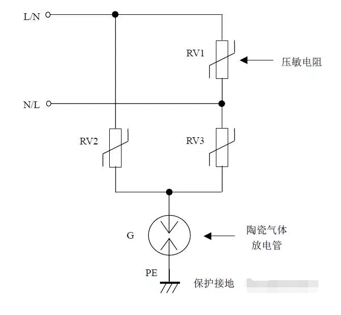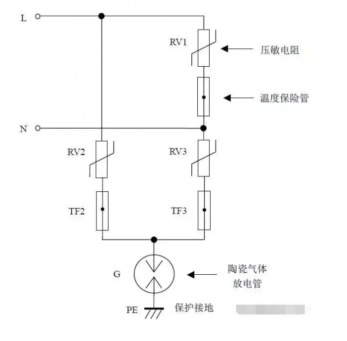 缺點(diǎn):壓敏電阻RV1短路失效后易引起火災(zāi)。最好在每個壓敏電阻上串聯(lián)一個工頻保險絲以防壓敏電阻短路起火。如果L、N線不可能接反,則可省去壓敏電阻RV2、RV3,將放電管G的上端直接接到N線上,構(gòu)成“1+1”電路。