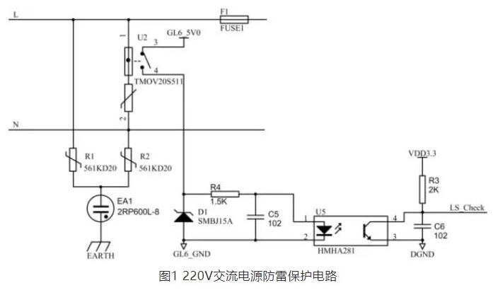 本電路由于采用了金屬氧化鋅壓敏電阻U2,因此能有效地避免傳統(tǒng)的氧化鋅壓敏電阻因短路失效可能帶來的火災(zāi)等安全隱患。與此同時(shí),如果因?yàn)槔讚魮p壞時(shí),其隔離的熔斷保險(xiǎn)絲將同時(shí)熔斷,主機(jī)CPU可以在LS_Check端檢測(cè)到相應(yīng)的信號(hào),從而起到雷擊損壞報(bào)警功能。