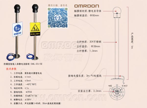 防爆型智能人體靜電消除球(本安型靜電消除器)帶聲光報警 OML-EX/SE-