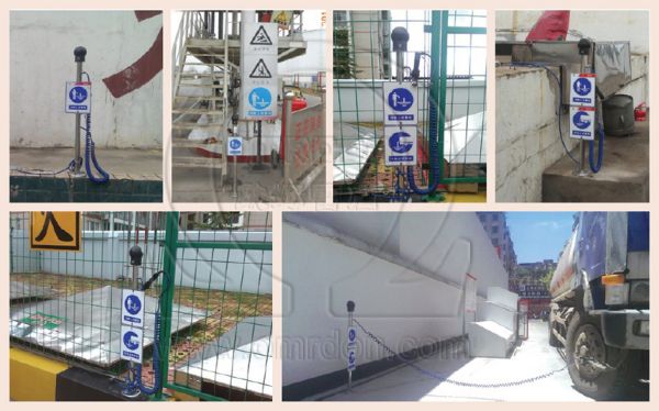 第14.3.13條規(guī)定:由于人們穿著人造織物衣服極為普遍,人造織物極易產(chǎn)生靜電,往往積聚在人體上。為防靜電可能產(chǎn)生的火花,需對進(jìn)入輕油泵房、輕油罐頂上、輕油作業(yè)區(qū)的操作平臺,以及爆炸危險區(qū)域等處的扶梯上或入口處設(shè)置消除人體靜電的裝置。此消除靜電裝置是指用金屬管做成的扶手,在進(jìn)入這些場所之前人體應(yīng)撫摸此扶手以消除人體靜電。